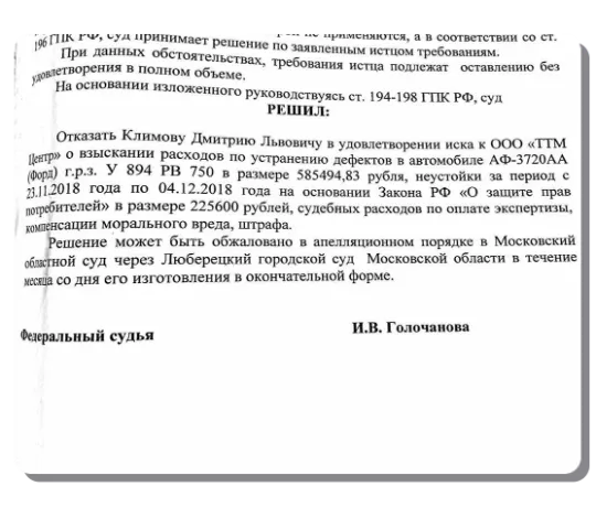 Истец Климов Д. обратился в Люберецкий городской суд Московской области с требованием взыскать с ООО «ТТМ Центр» расходы по устранению дефектов авто (почти 600 000 руб.).